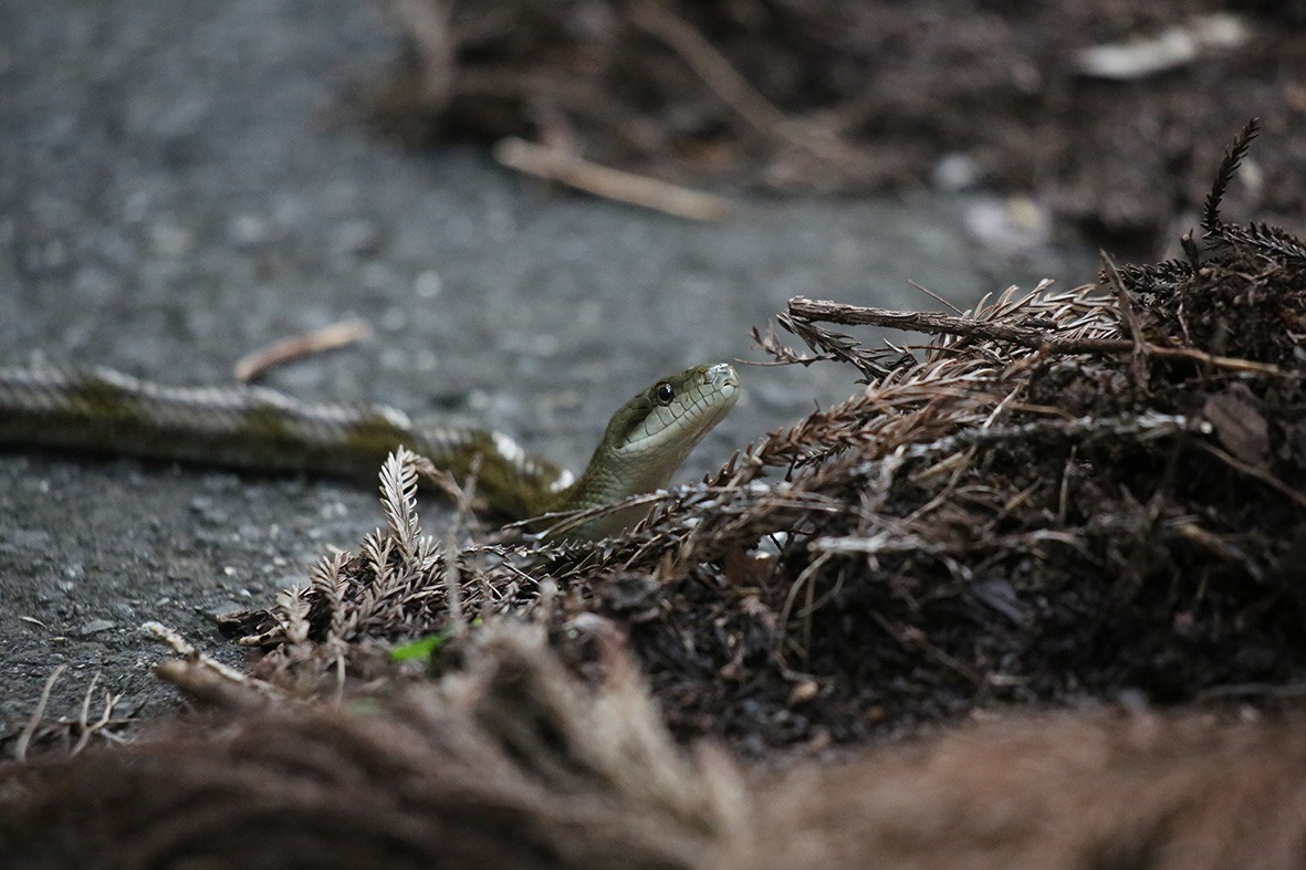 さらに車を走らせて進んでいくとヤマカガシが現れましたが逃げ足が速くて撮影できませんでした。がっかりしている今度はアオダイショウが体を力ませてジッとしていたのですかさずパシャリ!