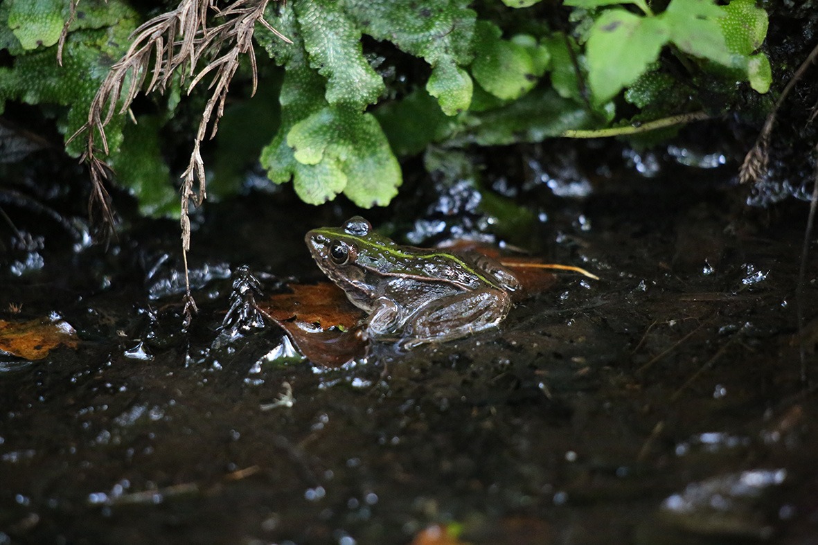 続いて近くの尾根沿いの染み出しを観察しているとトノサマガエルが現れました。トノサマガエルは田んぼでよく見かけるカエルですが、時々尾根沿いにも表れる不思議なヤツです。似た種のナゴヤダルマでないことを確認するため同定形質の足をしっかり延ばして確認させてもらいました。